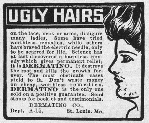 AD FOR DERMATINO HAIR REMOVAL BY THE DERMATINO COMPANY IN ST. LOUIS, MISSOURI, 1902. Credit: JAY PAULL / GETTY IMAGES